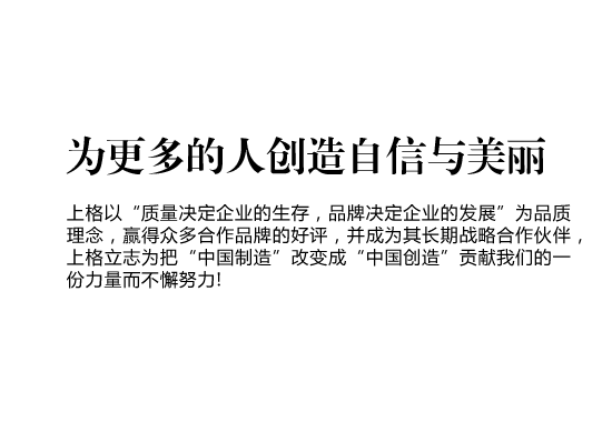 • 上格一路走來,以“締造時(shí)尚集團(tuán),使公司受人尊敬,令人向往;為客戶提升價(jià)值,創(chuàng)造成功;讓員工提高生活品質(zhì),實(shí)現(xiàn)自我價(jià)值”作為我們的目標(biāo),“為更多的創(chuàng)造自信與美麗” 作為我們的使命,立志為把“中國制造” 改變成“中國創(chuàng)造”貢獻(xiàn)我們的一份力量而不懈努力!